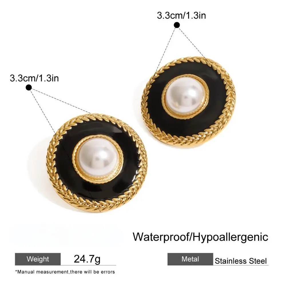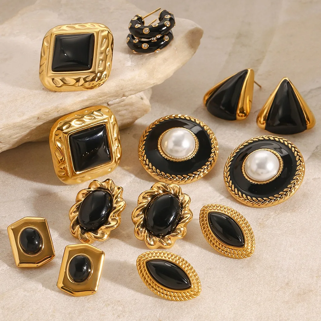 Classic 18K Gold Plated Women's Earrings Trendy Round Stud with Black Agate & Pearl on Stainless Steel Geometric Shape